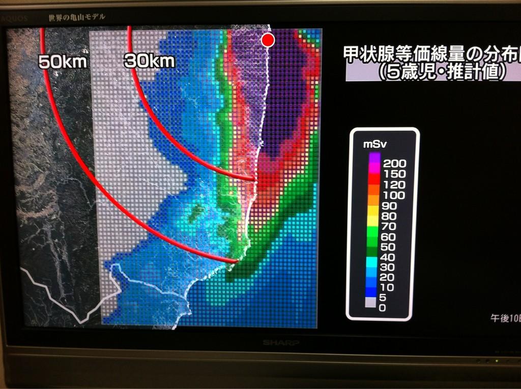 For some unknown reason, NHK decided to air a documentary on iodine-131 dispersion in the days right after the start of the Fukushima I Nuclear Power Plant accident in March 2011. In it, there was a simulation map created by researchers who carefully pieced together information without the government funding. It was a map of estimated thyroid dose equivalent exposure of I-131 for 5-year-olds.