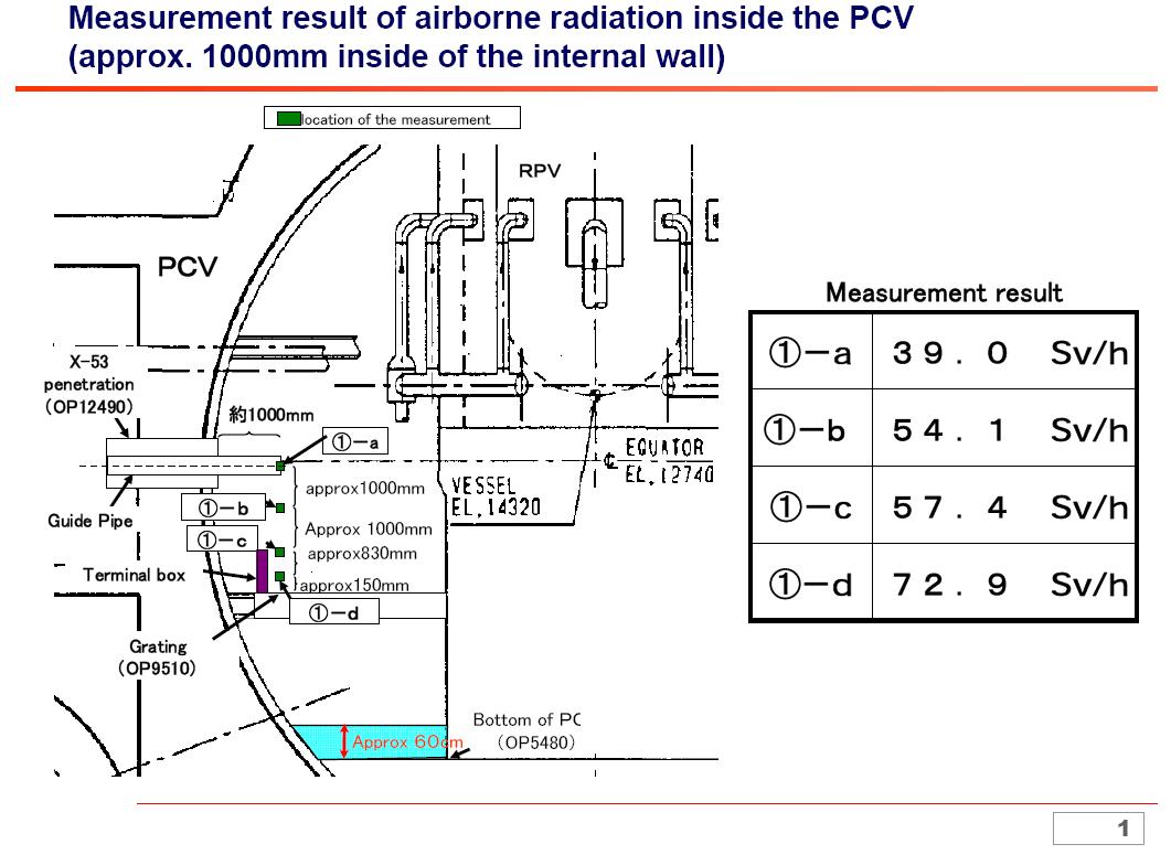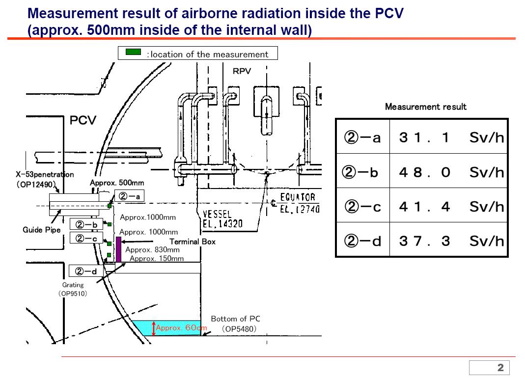 It is the highest level measured after the accident. If one is exposed to radiation at this level, the radiation sickness including vomiting starts in less than one minute, resulting in death in about 8 minutes. TEPCO says "It is impossible for human workers to work inside the CV. In order to fully understand the condition inside, it will be necessary to develop equipments that withstand high levels of radiation."