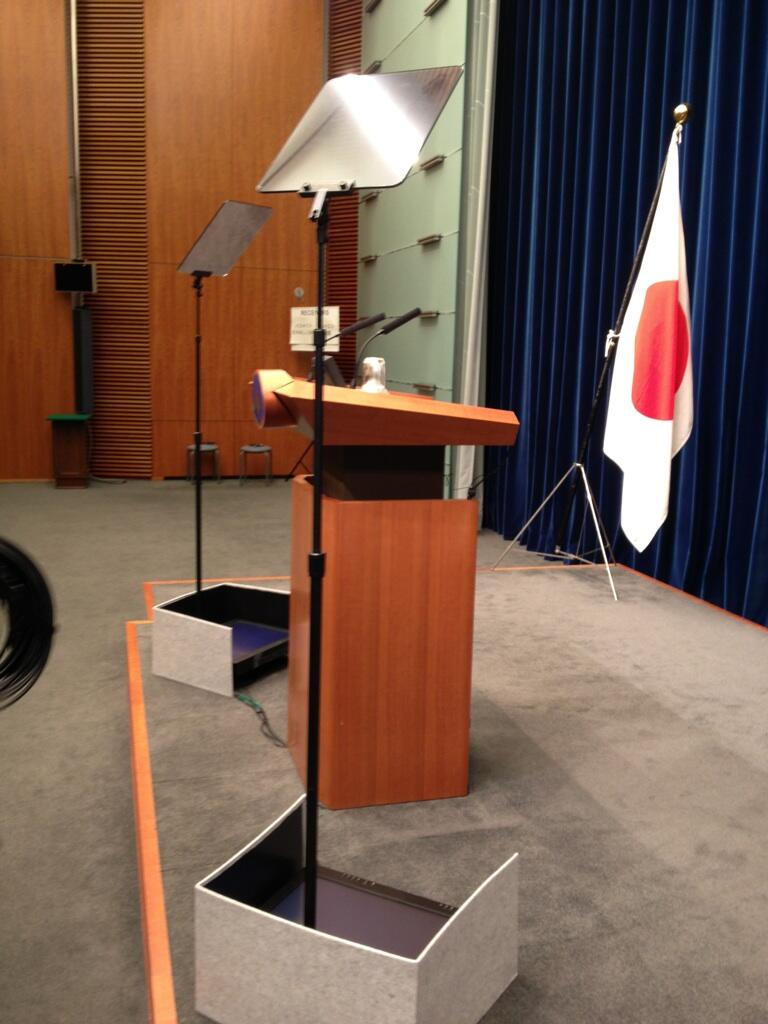 (The latest example of flattery is Abe's mimicking President Obama in using teleprompters for the first time to deliver his speech at a hastily scheduled press conference on December 14, 2013, probably just to show off his brand-new toy...image from Yasumi Iwakami)